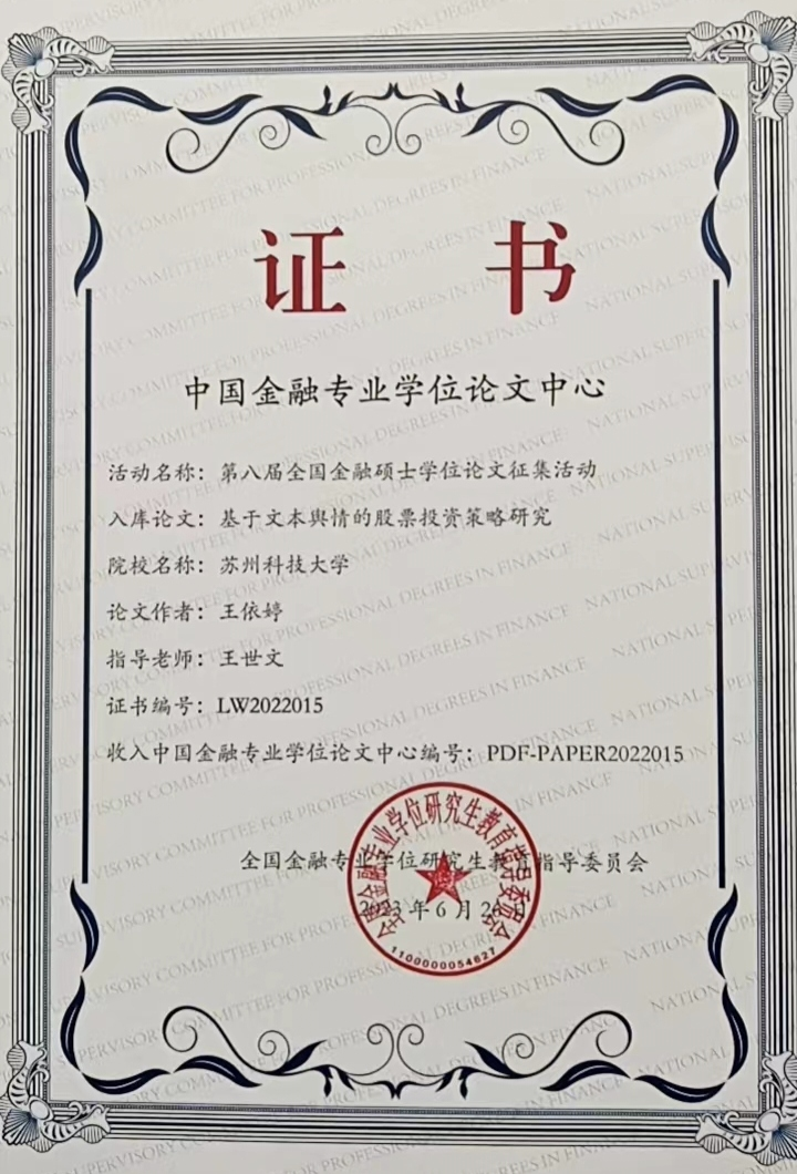 近日,第八届全国金融硕士学位论文征集活动结果已经公布,公司王世文老师指导的员工王依婷的论文《基于文本舆情的股票投资策略研究》喜获优胜论文,收入中国金融专业学位论文中心。