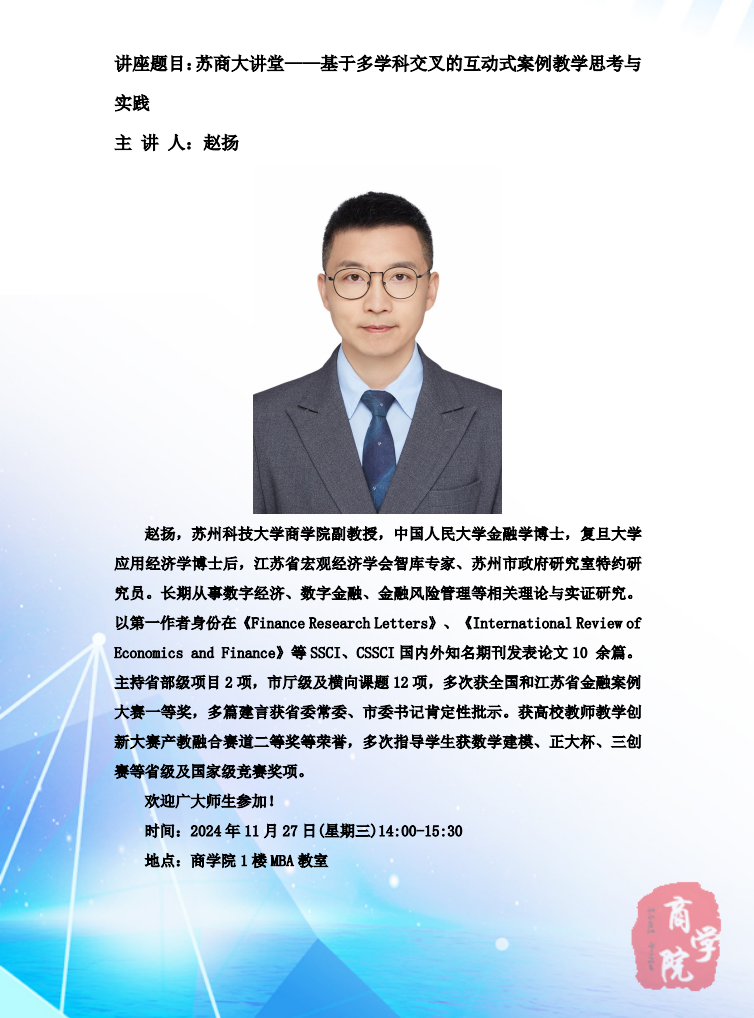 下一条:苏商大讲堂——Assessment of water-energy bidirectional coupling footprint and its ecological network analysis at industrial sector scale in China